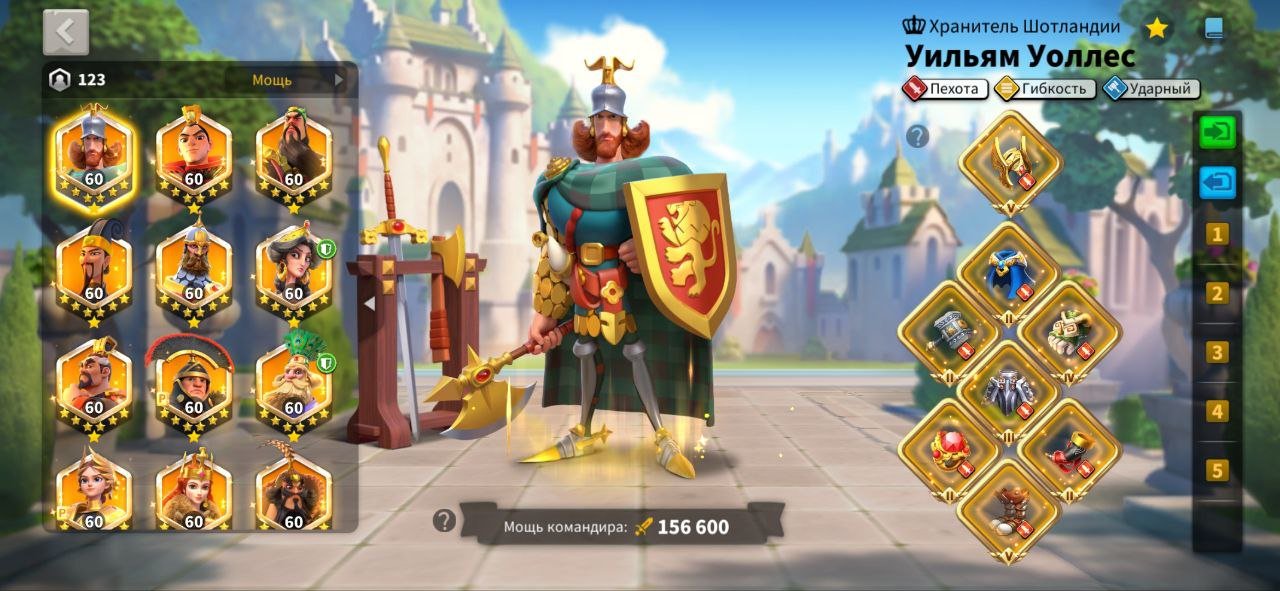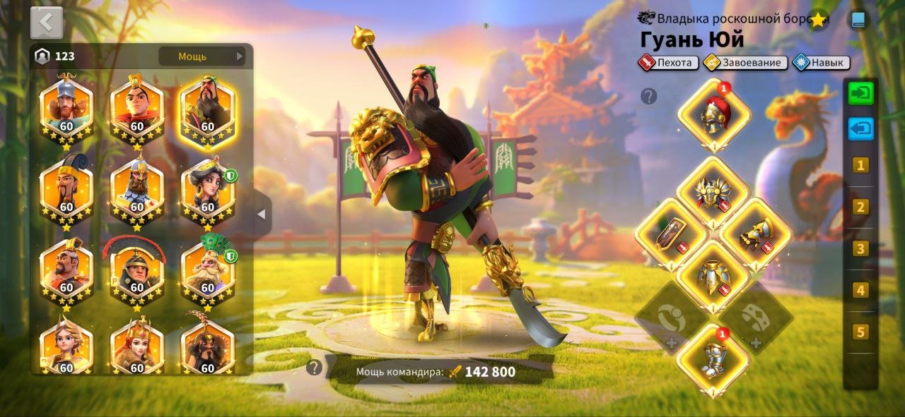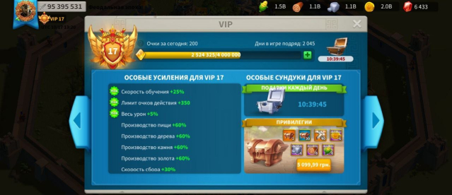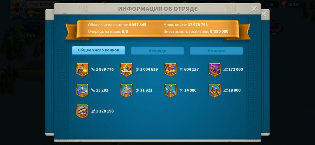 Подробное описание: VIP 17, мощь 94; Т5: 3 500 000, очки убийства 2 100 000 ,18 основных командиров (без сборщиков),450 свободних голов, 35легендарных снаряжения( 2 пех,2 кони,1 луки)