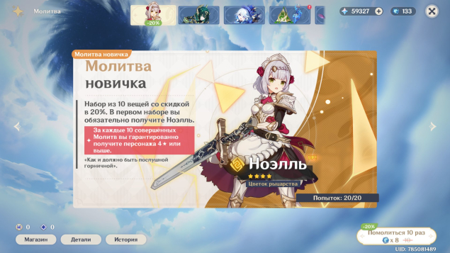 ◼ 550-600 круток — общее число круток, высчитывается по данной формуле — Примогемы + Стандарт молитвы + Ивент молитвы + Скидка новичка + Крутки в магазине пайман за Звездный блеск + звездную пыль = 550-600 круток в сумме