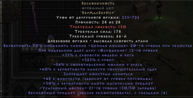 Подробное описание: Элитная база Ethereal Giant Thresher 325 увеличенный урон -54 к сопротивлению молнии у противника