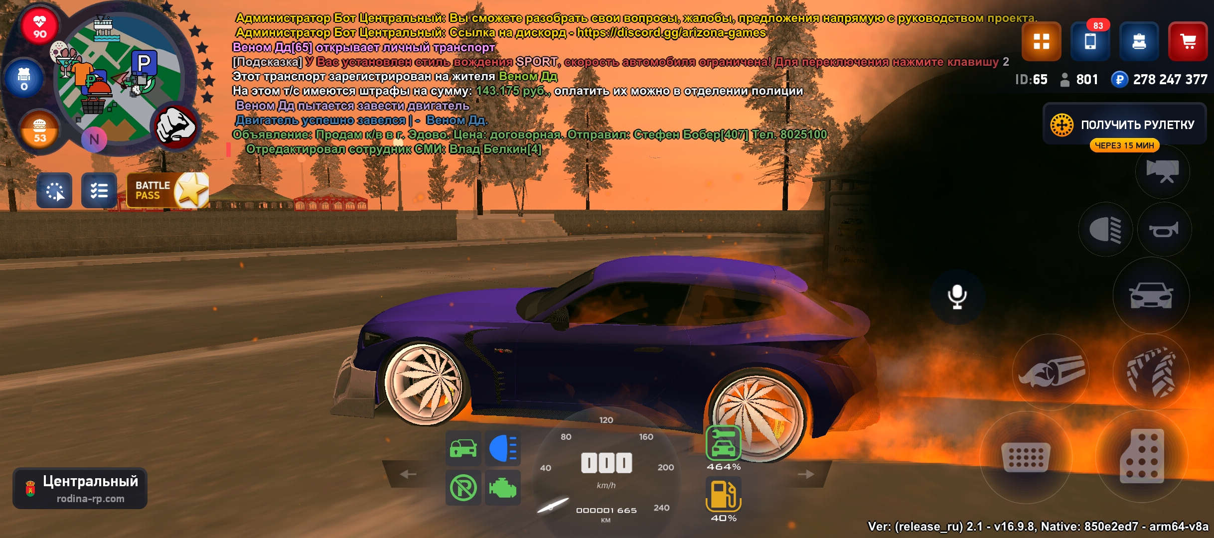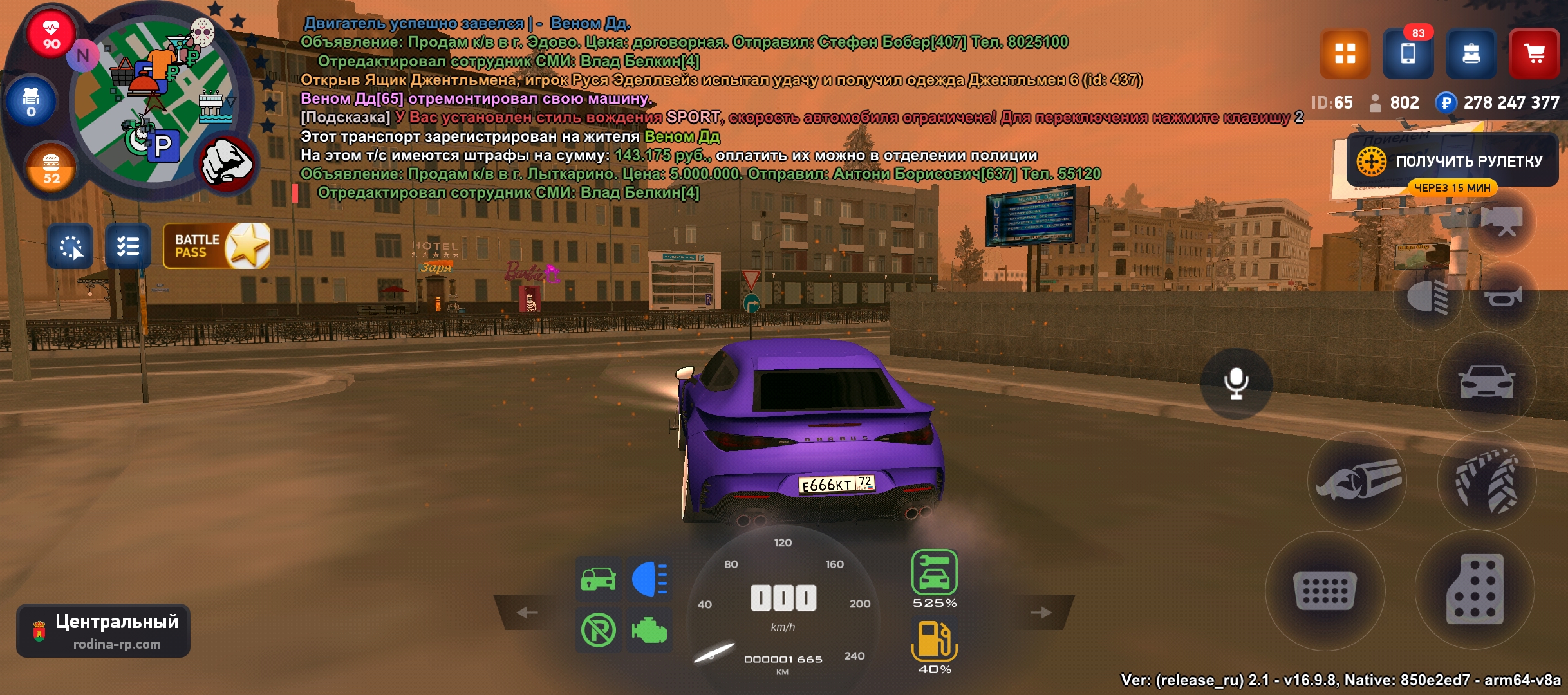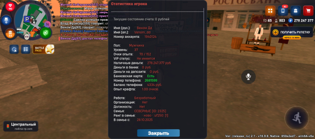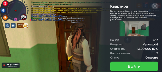 На аккаунте имеется квартира в центре, рядом центральный банк, центральный рынок, находится напротив храма, автомобиль BRABUSROCKET gts (цена от 1,6-2ккк может и больше) стоит отбойник, диски травка огненые, есть пневма, нитро, сам чинит внешку, фт+ стэйдж3 фул Макс скорость 560км/ч, есть мерс е500, и другие автомобили сертефикатом, игровая валюта в размере 278кк миллионов, куплены все лицензии сроком на один год, различное барахло в инвентаре смотреть на фото