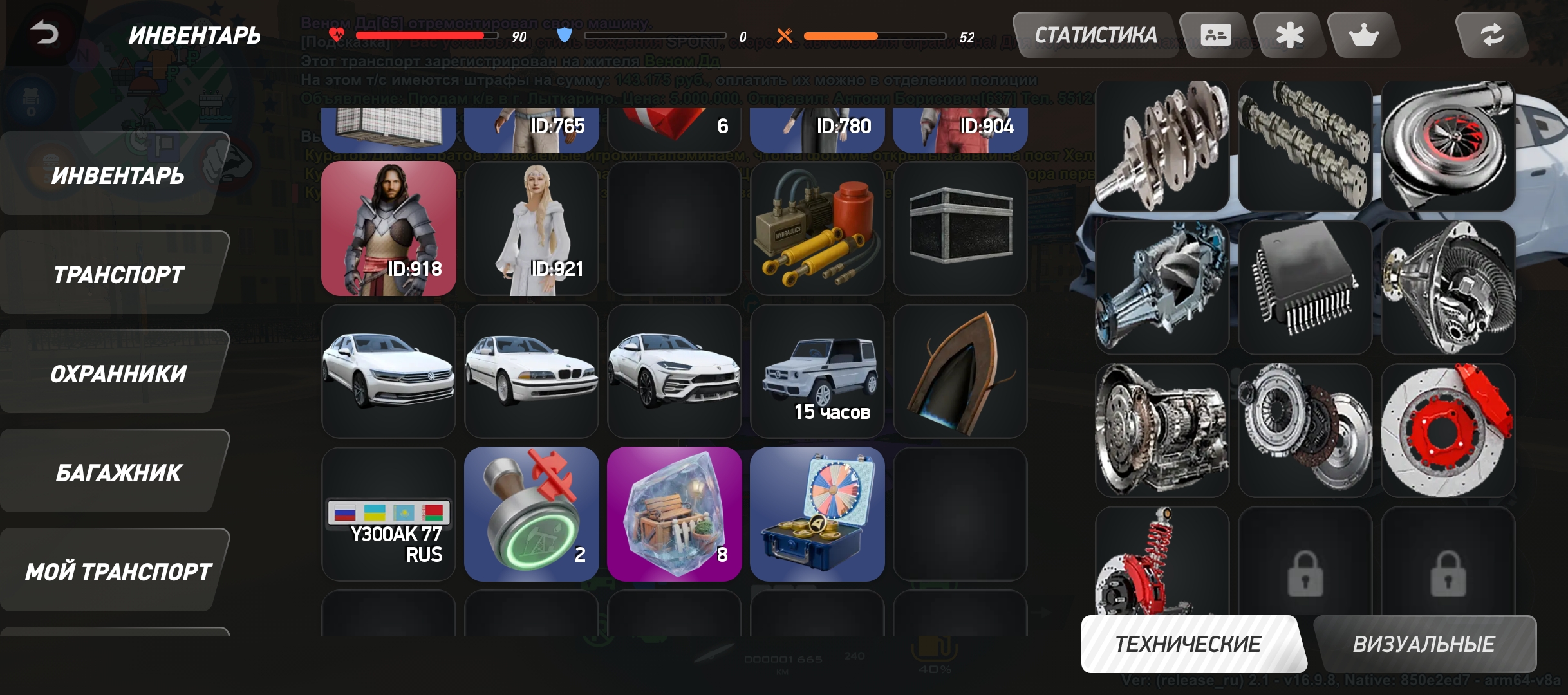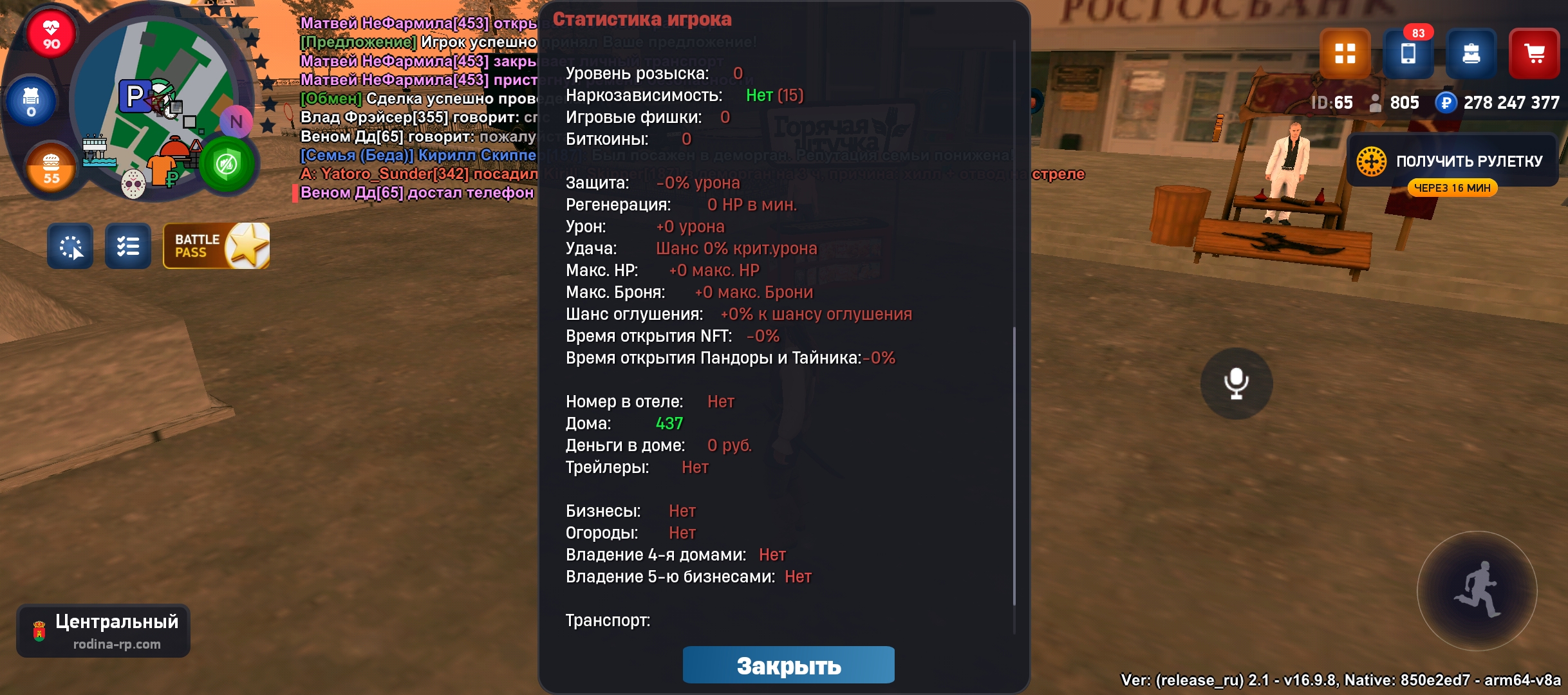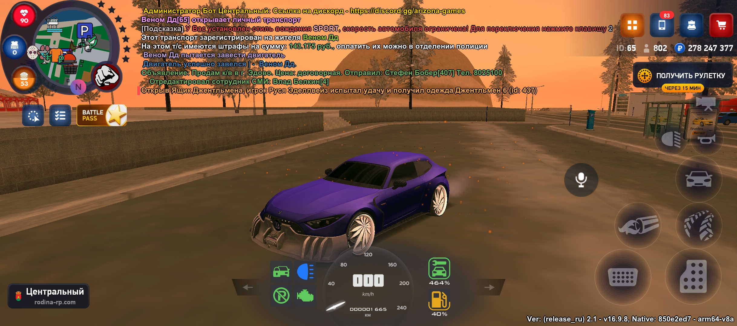 На аккаунте имеется квартира в центре, рядом центральный банк, центральный рынок, находится напротив храма, автомобиль BRABUSROCKET gts (цена от 1,6-2ккк может и больше) стоит отбойник, диски травка огненые, есть пневма, нитро, сам чинит внешку, фт+ стэйдж3 фул Макс скорость 560км/ч, есть мерс е500, и другие автомобили сертефикатом, игровая валюта в размере 278кк миллионов, куплены все лицензии сроком на один год, различное барахло в инвентаре смотреть на фото