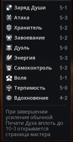 ⚙️ Печати Духа: Заряд Души 5-1, Атака 5-3, Хранитель 5-2, Завоевание 5-2, Дуэль 5-0, Энергия 5-3, Самоконтроль 5-2, Воля 5-1, Терпимость 5-0, Вдохновение 4-2.