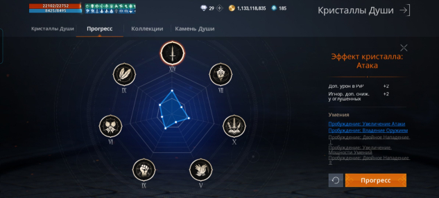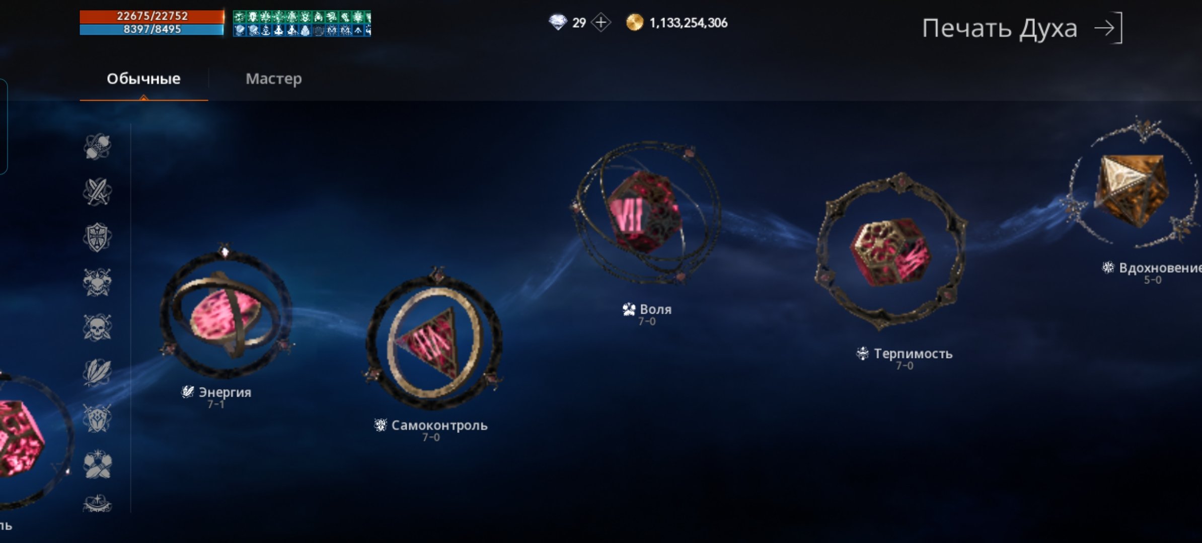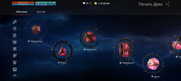 Печати Духа: Заряд Души 7-0, Атака 7-0, Хранитель 7-0, Завоевание 7-0, Дуэль 7-2, Энергия 7-1, Самоконтроль 7-0, Воля 7-0, Терпимость 7-0, Вдохновение 5-0