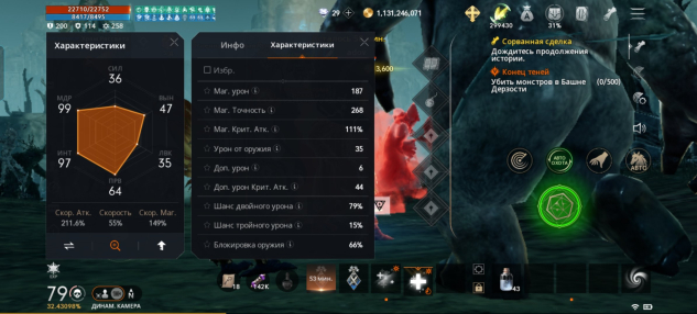 Другие Характеристики: Крит Атака 111%, Шанс Двойного Урона 79%, Шанс Тройного Урона 15%, Блокировка Оружия 66%, Увеличение Урона от Оружия 130%, Увеличение Урона от Умений 185%, Сопротивление Оглушению 49%, Шанс Оглушения 35%.