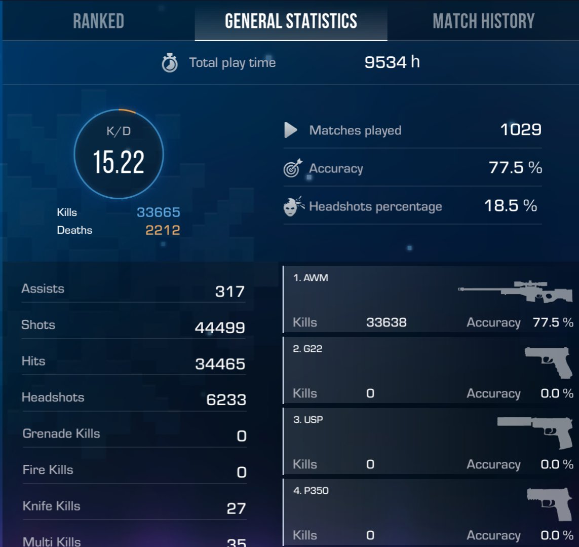 в общей статистике 9500+ часов, 33 тысячи убийств на 2.2 тысячи смертей, на аккаунте никогда не использовалось стороннее П/О, вся статистика была набита лично мной