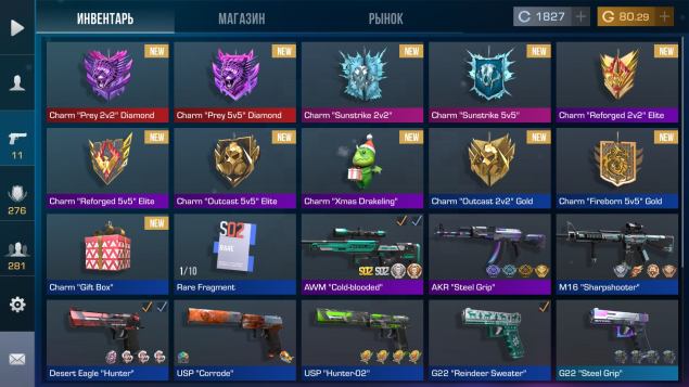 ✅ В инвентаре есть немного скинов, а также эксклюзивных предметов (сезонные награды, брелоки, рамки)