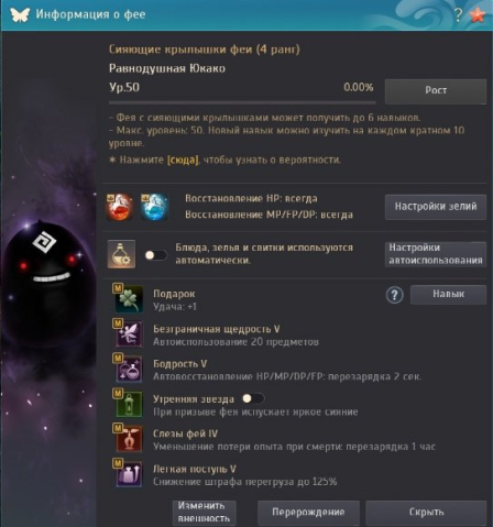 Топ фея — Щедрость 5; Бодрость 5; Слезы фей 4; Легкая поступь 5; Утренняя звезда.