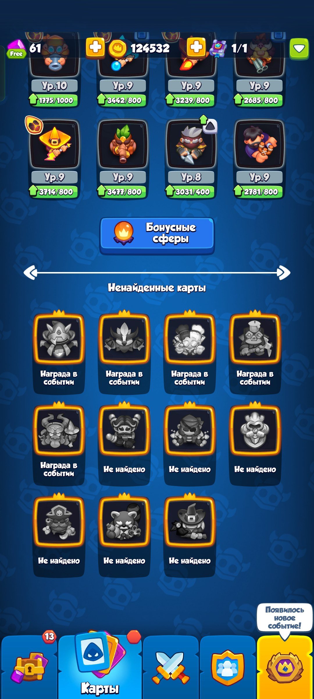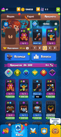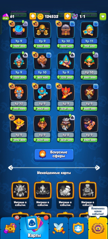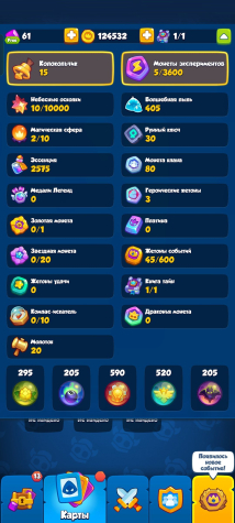 Краткое описание: | 1449% крита | 4621 кубок | 10/13 героев | 64/75 карт | 124832 золота |Подробное описание: На аккаунте имеются множества полезных предметов такие как Эссенция в количестве 2575шт, также имеется множество ядер фракций, ядра леса-295, магии-205, Технологии-590, света-520, тьмы-205. Для мгновенной прокачки персонажа имеется Книга тайн(прокачивает персонажа на след. уровень не зависимо от ресурсов). Все остальное приведено в скриншотах снизу.