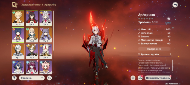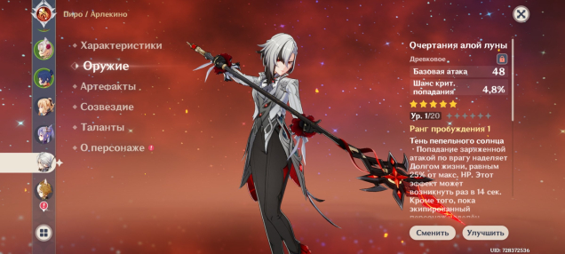 Краткое описание: [5AR] без ПО ⭐ 5* Арлекино + сигна Очертания алой луны + 5* Кэ Цин + 5* Джинн
