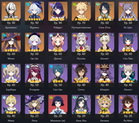 Краткое описание: Райден+Арлекино+Фурина+Сянь Юнь+Кэ цин+Мона+Цици | Приятный аккаунт для игры