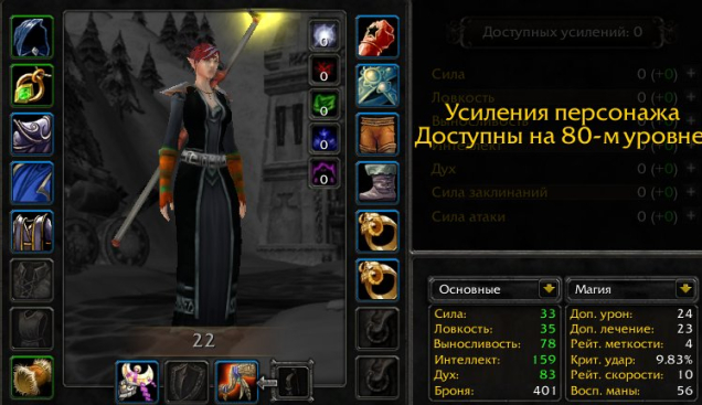 Нагрудник +3 ко всем характеристикам; Плащ +70 к броне; Наручи +7 к интеллекту; Перчатки +10 к скорости; Ступни +7 к выносливости; Посох +9 к интеллекту. Все собранное при прокачке остается на персонаже.