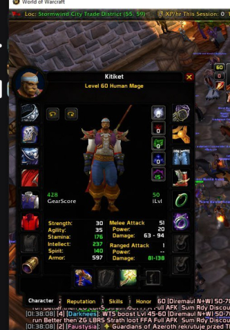 Подробное описание: Маг, женщина, UA подписка, 60 уровень, зеленый гир, 60% маунт подписка не активна.Снизу прикреплен скриншот мужика женщина если что в таком же гире