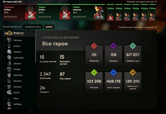 ⭐💛 Было сыграно 16 матчей, винрейт 94%💛⭐