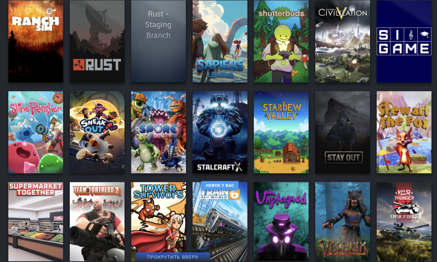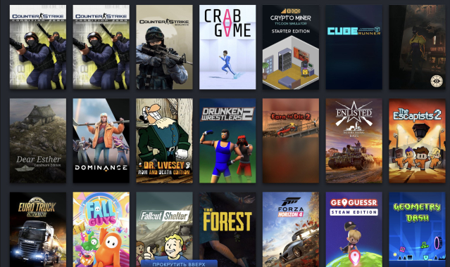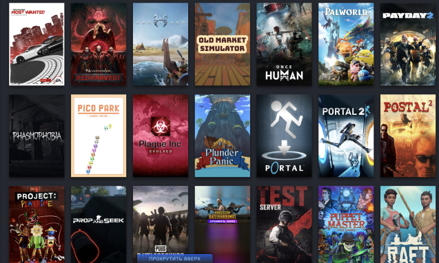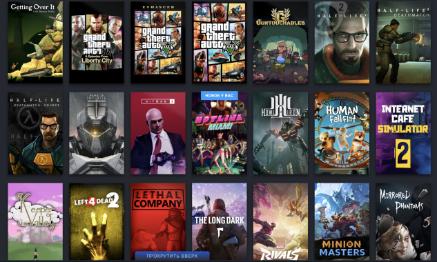 Есть такие игры как: GTA5, rust, spore, GTA4, Arma3, ARK:SE, BeamNG, City Skylines, Clustertruck, CS (Все версии), Deadlock, The Escapists 2, ETS 2, Fall Guys, The Forest, Forza Horizon 4, Geometry Dash, Valve Bundle, Internet cafe Simulator, Human Fall Flat, Lethal Company, The Long Dark, NFS: Most Wanted, Northgard, Old market simulator, palworld, phasmophobia, plague inc, raft, ranch simulator, Civilization V, Slime rancher, Soundpad, Stardew Valley, Valheim, Wallpaper Engine, The wild eight, witch it, age of history ii, among us и многие другие...