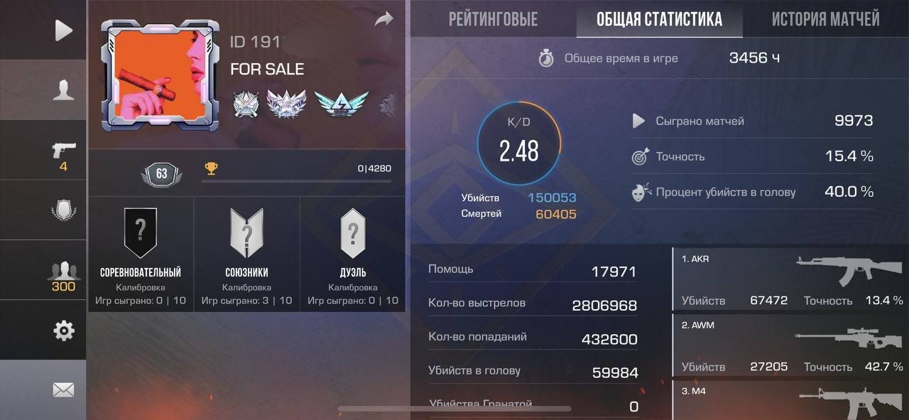 Звание: Без калибровкиКраткое описание: Старейший аккаунт с самыми редкими медалями, брелоками в игре. А также красивый, 8-значный айди