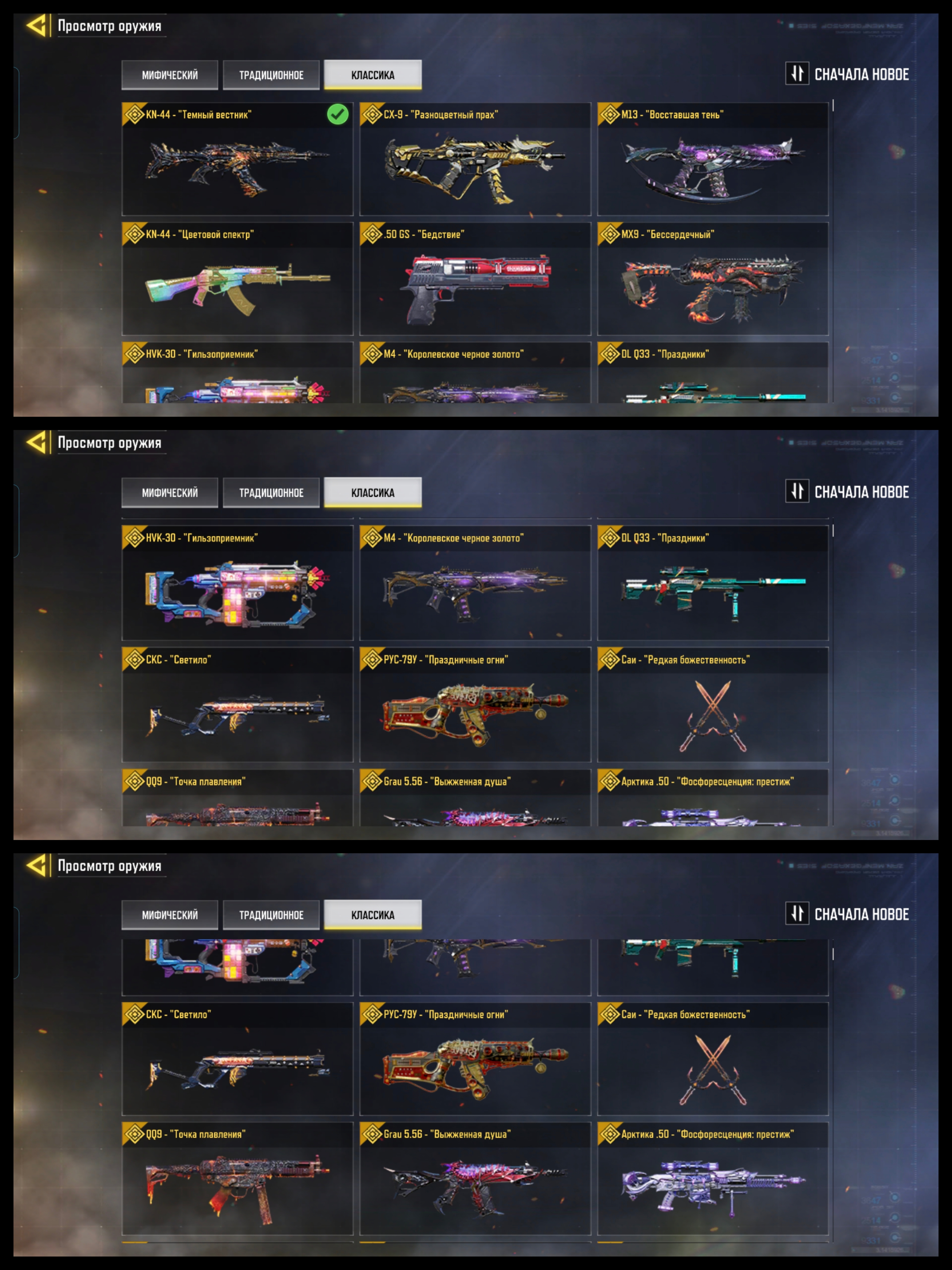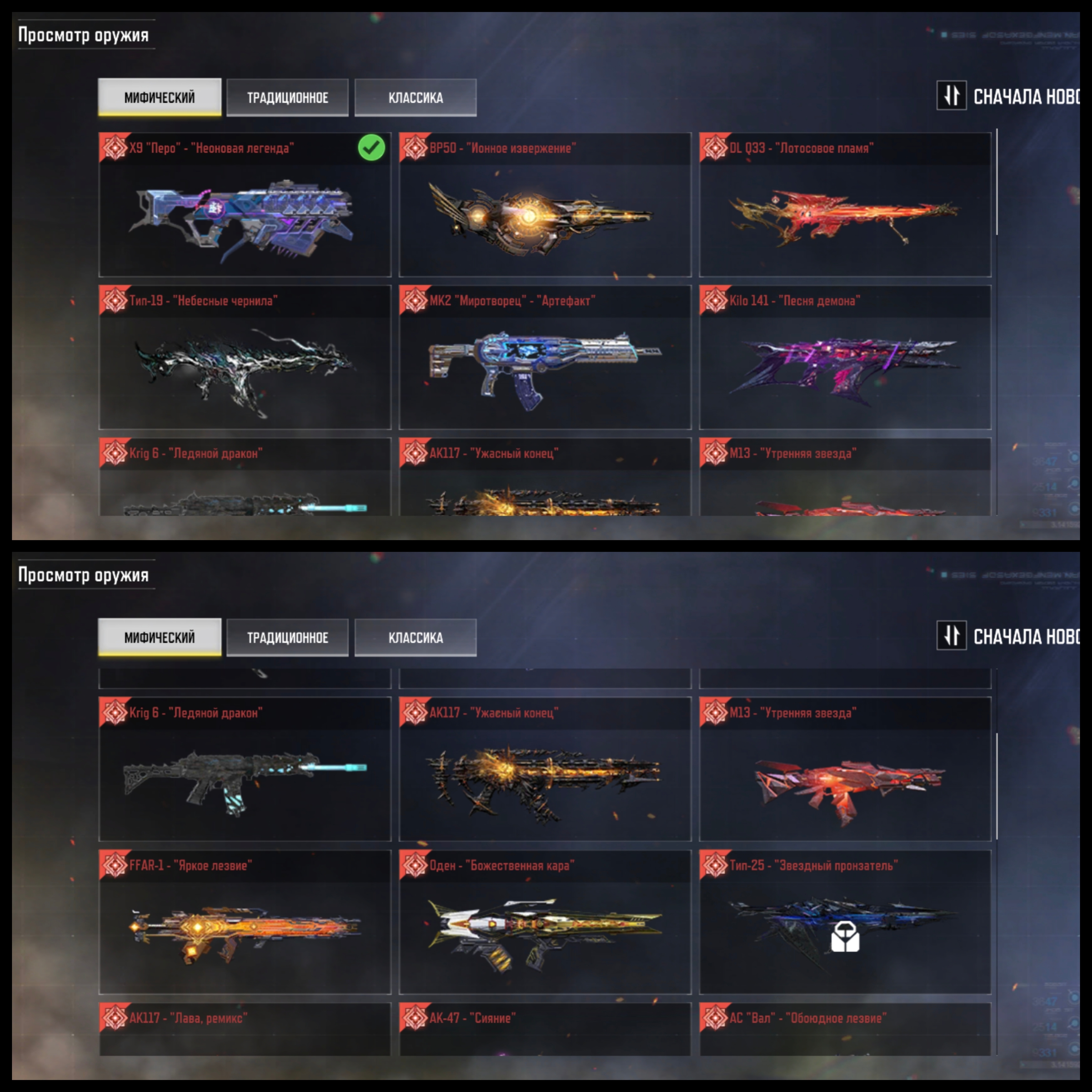 11 миф оружия, Ak-117 «Ужасный конец» фулл прокачка, Krig-6 «Ледяной дракон» фулл прокачка,FFAR-1 «Яркое лезвие» 4 уровень,DL-Q33" Лотосовое пламя" 3 уровень,Kilo-141 «Песня демона» 3 уровень,M-13 «Утренняя звезда» 3 уровень, Оден «Божественная кара» 2 уровень,MK2 «Миротворец»-«Артефакт» 2 уровень, Тип-19 «Небесные чернила» 1 уровень,X9 «Перо»-«Неоновая легенда» 0 уровень, BP50-«Ионное извержение » 0 уровень