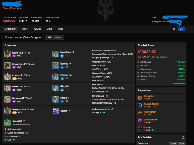 1742 Slayer +25 Weapon — Decent Ark Grid — Weapon quality 100 — Chest quality 100 — the rest are above 93 quality