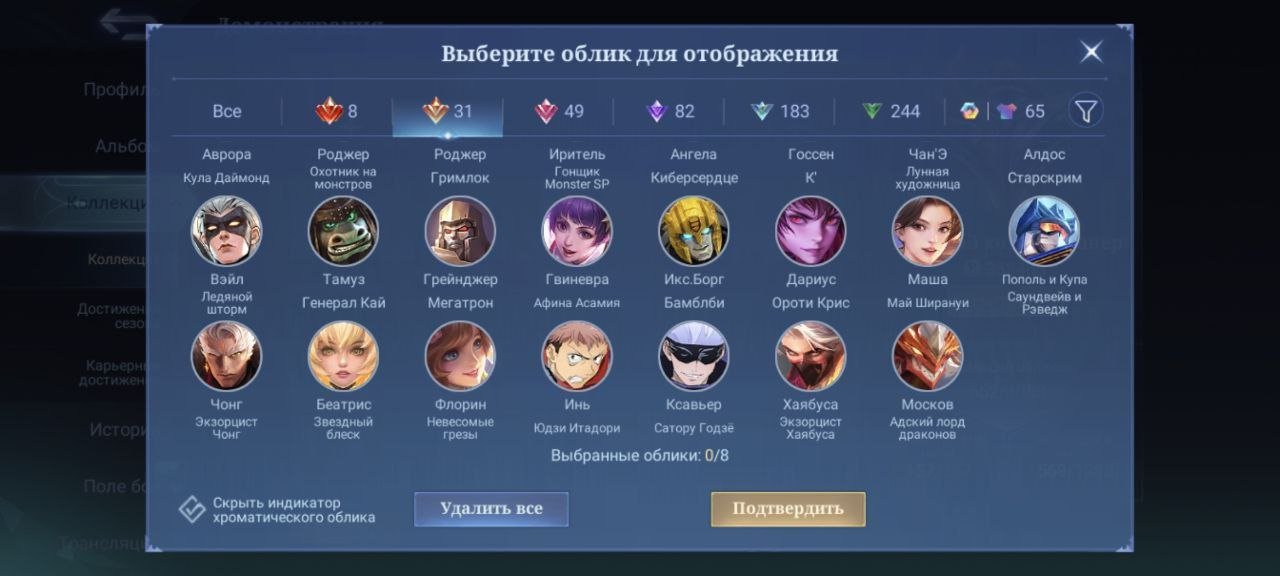 Легендарные скины (8): Мия, Сабер, Алукард, Франко, Горд, Лесли, Валир, Грейнджер;