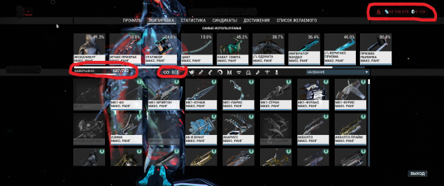 Краткое описание: Аккаунт warframe 2015 года, почти все фреймы и моды разлома на 150 слотов