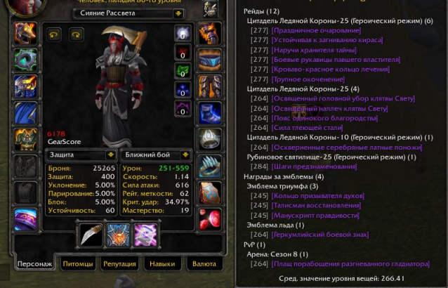 Крутой основной персонаж на котором я очень долго играл и одевал + сам апал рейтинг в солоке ( 2500+ в статистике). Много разного шмота на каждый спек.
