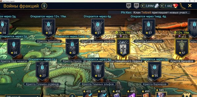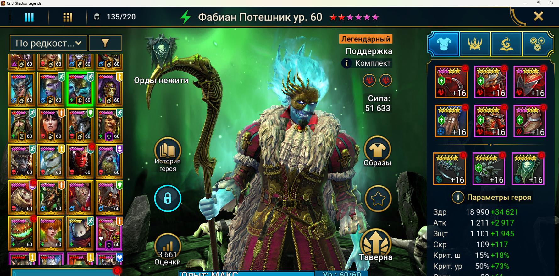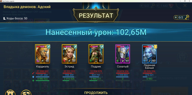 Об аккаунте: закрыввается 5 ,6 кб. 6 кб закрывается за 2 ключа. Первая гидра стоит 1000 ходов наносится примерно около 120-160 миллионов урона все благодаря связки Шайка и Кроукада, другие гидры бить не пробовал. Роковая башня обычная закрывается полностью, Трудная стопится где-то на 80 этажах. Проклятый город на обычном уровне закрывается когда попадается нормальная ротация, к сожалению в этот раз на лунного архонта нет героя с штрафом лечение иными словами в этой локе не бьется. В трудном городе стопиться на бомалле нет героев.На аккаунте много донатных шмоток.На донат в аккаунт было потрачено 400000 рублей. Использовал как основну, решил перейти на другой .