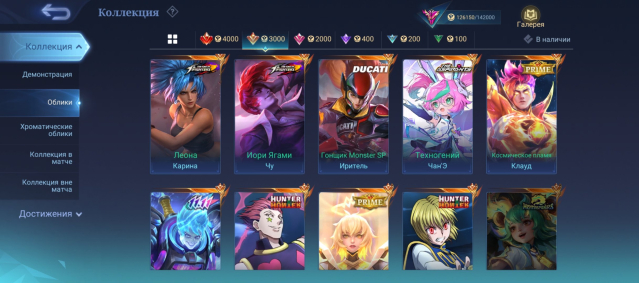 Есть такие скины как (HANTER x HANTER, Ducati, аспирант, много спешелов, почти вся колл Zodiac)