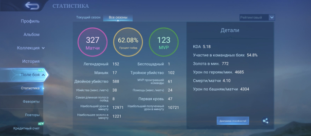 Процент побед: 62
