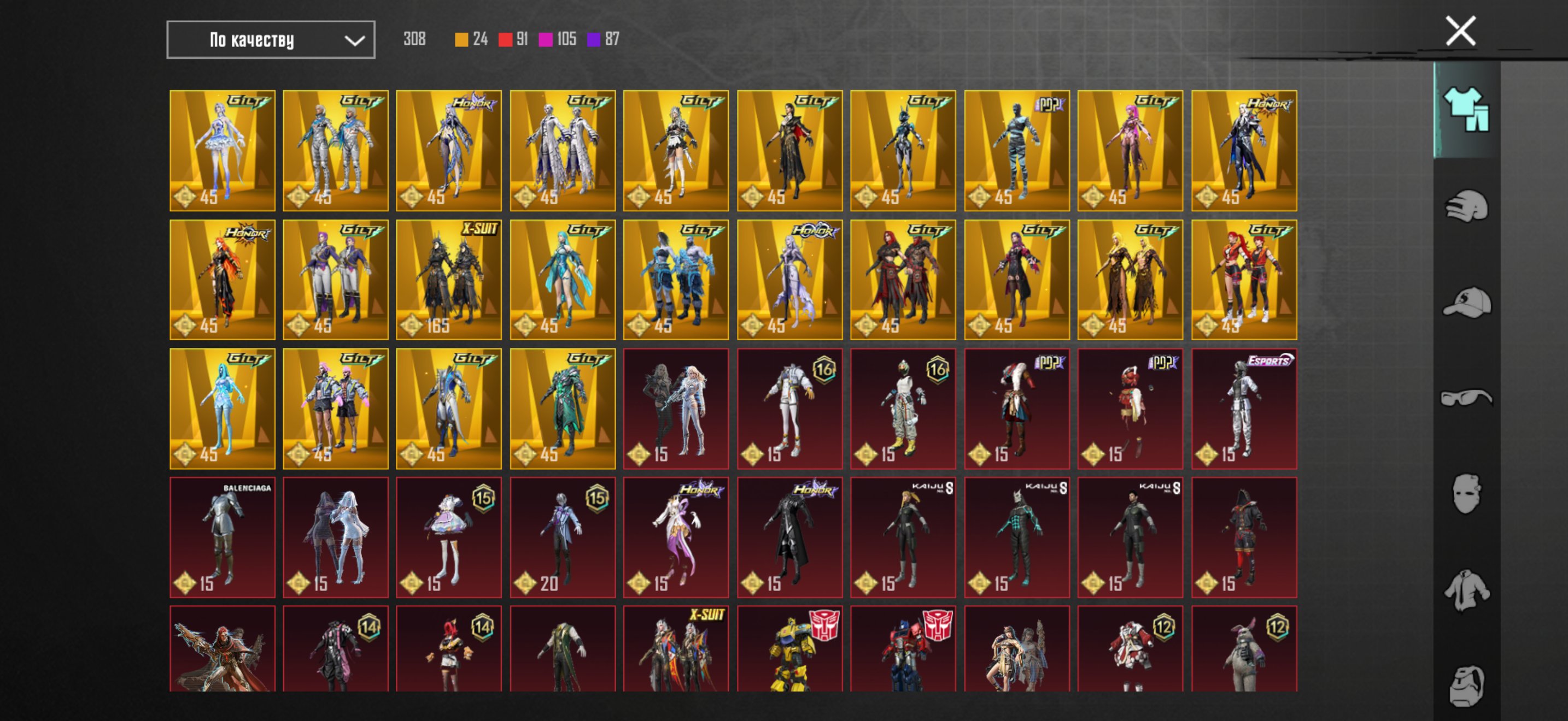 550 краски, 3 мифических самолета, 3 легендарных ведомых, 19 мифических планеров, 9 постоянных лобби (три улучшенные), 5 компаньонов, 100 мифических эмоций, мифические перчатки Золотые пески. Стойка и лобби за битву ПП, много фулл коллекций, рулеток, обвесов. Бригадка, адмирал, инферно. Торга нет, комиссия площадки 30к.