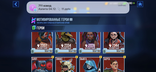 Краткое описание: Аккаунт с 10к, 1/3 всех персов перевел в боги, остальные в предбожественном на топ прокачкеПодробное описание: Аккаунт с 10к, 1/3 всех персов перевел в боги, остальные в предбожественном на топ прокачке, более 1000 баксов и 2500000 голды, гаек в снарягу вложено достаточно, все вложено с умом, сеты на персонажах выставлены в соответствии с мнением киберспортсменов, статистика боев к убийствам составляет более 2х убийств на 1 бой, много легендарных и эпических скинов (на каждого персонажа по несколько), дроны вкачены хорошо. Разместил в фото пример прокачки Берты и Гравиэля, которыми играю на фулл персоналках. По всем интересующим вопросам обращайтесь, буду рад ответить! Цена более чем разумная с учетом нафармленного и прокаченного