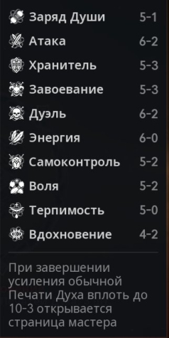 ⚙️ Печати Духа: Заряд Души 5-1, Атака 5-3, Хранитель 5-2, Завоевание 5-2, Дуэль 5-0, Энергия 5-3, Самоконтроль 5-2, Воля 5-1, Терпимость 5-0, Вдохновение 4-2.