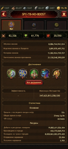 Подробное описание: 77 вип, 41 дом(всё здания макс лвл), убийца, фул 15 шмот(убба, кнуд, бродир, асгард), на героя есть лунная леди, защитник аварии и наследник империи, 69 свет, 300т моги, есть скин на поход