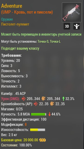 Сервер: RU-7Краткое описание: UMP(ЮМП) Adventure M8, урон +32.3 % 205-344 в краске Кровь, пот и пиксели (Любой сервер)