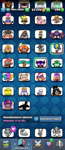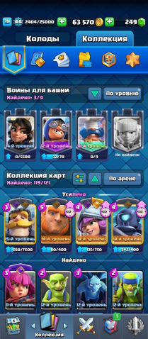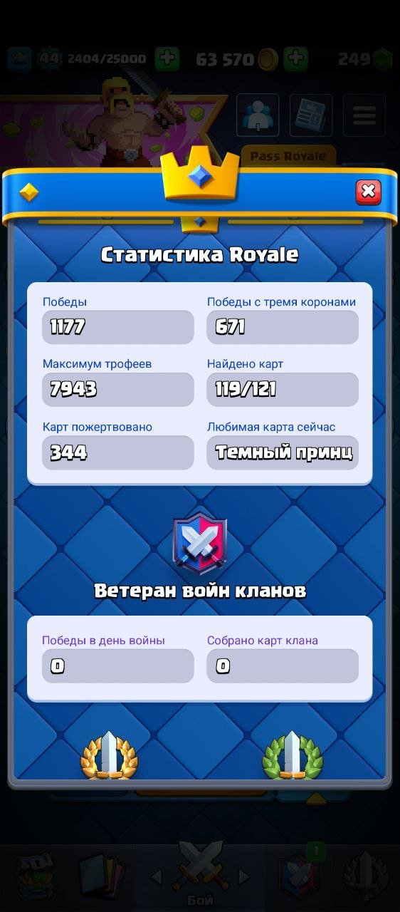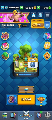 Сила (к): 44Краткое описание: Жирнеющий аккаунт СLASH ROYALE.НЕхватает 2 чемпионов.Покупался 1 пасс рояль