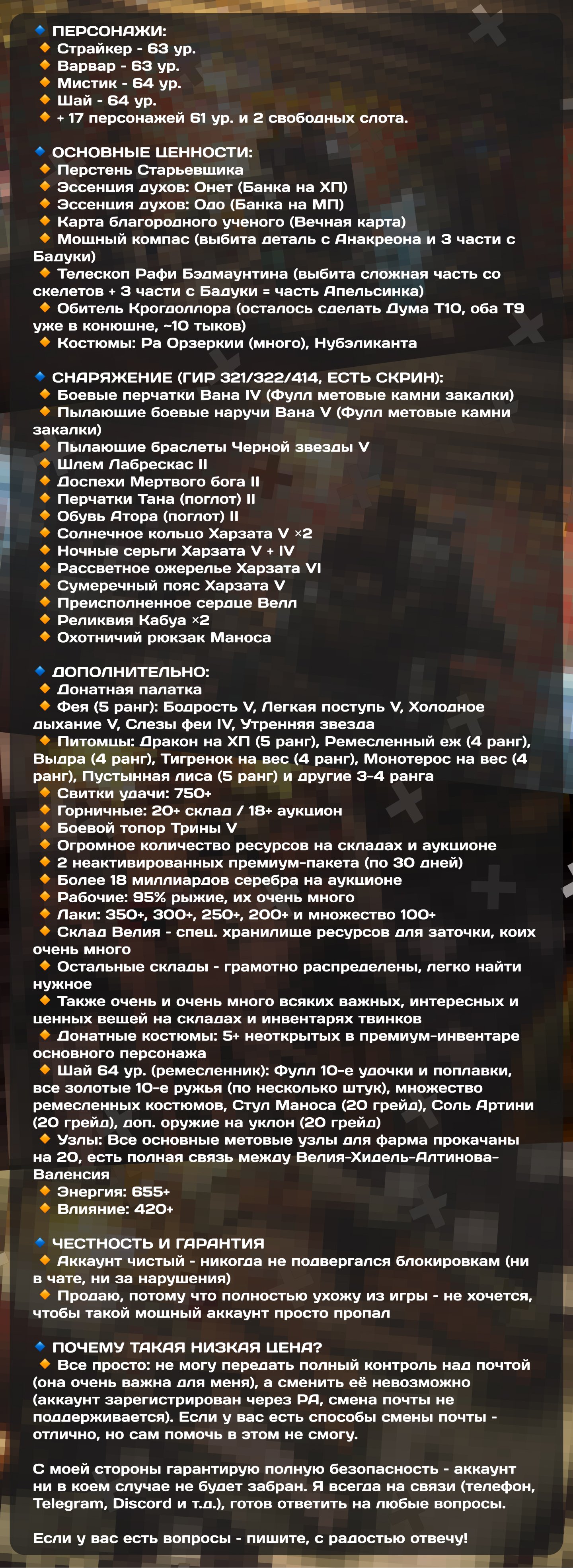 Выбирайте вариант, который подойдет Вам по соотношению «цена-качество», уточняйте в ЛС вопросы — мы свяжемся с игроками, проверим условия, актуальность и доступность предложений и поможем провести максимально безопасную сделку.