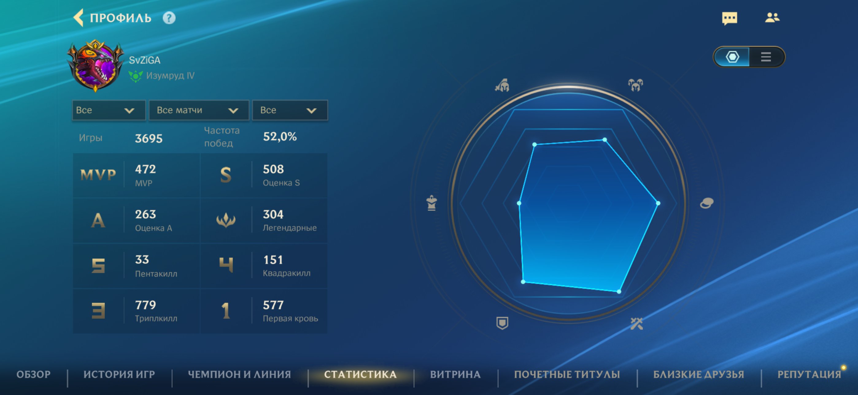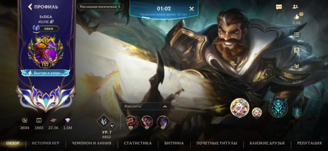 Подробное описание: Уровень 152, 3694 матчей, 1865 возраст учетной записи, 22570 очков коллекции, более 2000 👍🏻, куча статистик на килы, большое количество скинов на многих персонажей, в том числе и легендарные!