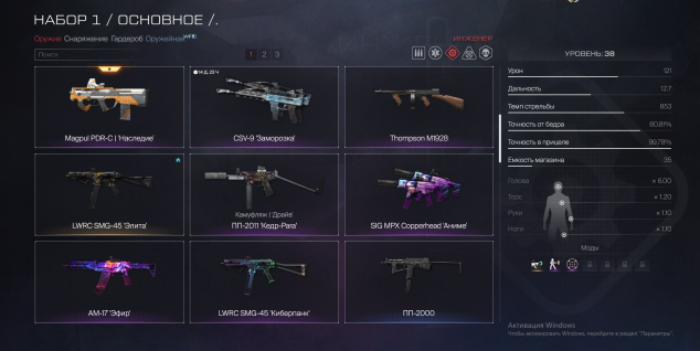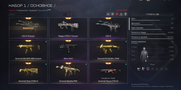 🥇Инженер: CSV-9, Magpul PDR-C, Золотой FN Scar-L PDW, Золотой SIG MPX SBR Custom, Micro-Roni, Золотой Tavor Ctar-21, Золотой Beretta PMX, Золотой Taurus CT9 G2, Thompson M1928, LWRC SMG-45 Элита, Sig MPX Copperhead Аниме, AM-17 Эфир, LWRC SMG-45 Киберпанк, ПП-2011 Кедр