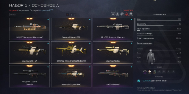 🥇Снайпер: МЦ-572 Астарта, Золотой Sabatti STR, Золотая СВЧ-54, Золотой Truvelo CMS, Золотой AX-308, Золотой ОЦ-48К МК2, AX308 Магма, Steyr Scout Киберпанк, McMillian CS5 Магма, M1917 Enfield, Винтовка Мосина, Remington MSR Элита, Золотая M14 Crazy Horse