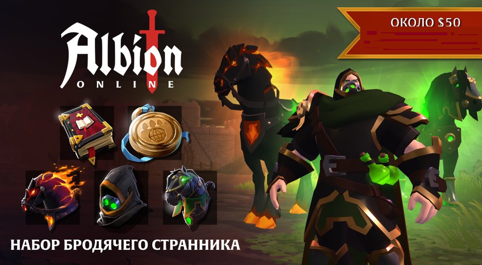 Набор бродячего странника для Albion Online содержит костюм бродячего авантюриста, оболочку бронированной лошади, бутыль с ядом, оболочку адской лошади, 350 жетонов сообщества, 500 очков обучения, 10 зелий восстановления фокусировки, 10 книг интуиции и не только. По словам авторов, общая стоимость всех предметов из данного набора составляет около 55 долларов.