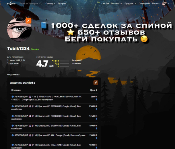 Уважаемые покупатели, в моем ассортименте десятки тысяч товаров — я и моя команда в режиме 24/7 опрашиваем игроков в онлайн-играх и собираем от них предложения на продажу: аккаунты, внутриигровую валюту, предметы/скины и выполнение услуг.