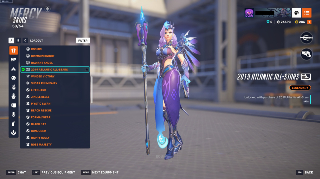 OWL Skins: 2020 Atlantic All-Stars Reinhardt; Seoul Dynasty Cassidy; 2018 Pacific All-Stars, Seoul Dynasty Genji; 2019 Atlantic All-Stars HangzhouMercy