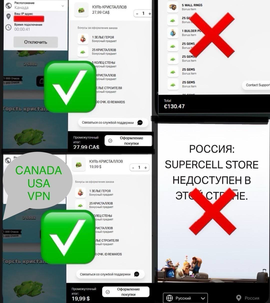 1. Смогли ли зайти, не высветилась ли страница, что supercell store заблокирован в России.( входите используя впн )