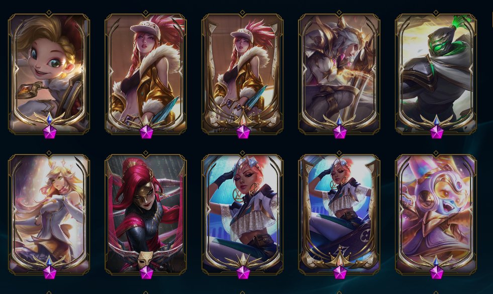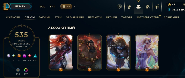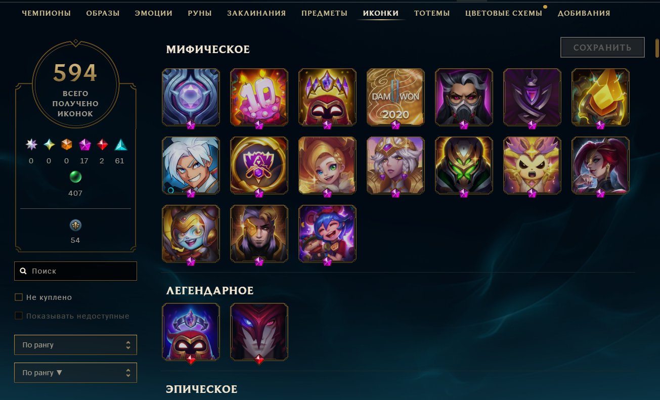 Из редких скинов: Ривен ЧМ 2012, КоронаВирус Кеннен, Все TPA Скины, Урфик Корки, Зед 2016 ЧМ с рамкой и Хромой, )(Воинственная К. Катарина, 4 Абсолютки (Мф, Удир, Эз, Сона), 43 леги. 235 эпических)