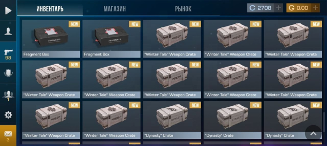 “Winter Tale” Knife Case (1), “Winter Tale” Weapon Case (10), “Chameleon” case (2), “Dynasty” Case (1), “Fable” Case(1), “Revenge” Case(1), Fragment Box (8), “Chameleon” case (2), “Winter Tale” Gift Box (10).