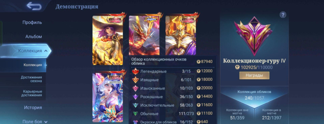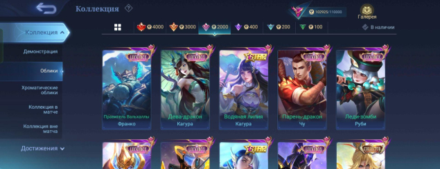 По Обликам: Леги: Джонс, Лейла, Лесли. Коллектор: Ксавьер. Коф: Карина. Аллстар: Москов. Аспиранты: Вексана, Чанэ. Хеллоу Кити: Чанэ, Флорин. Лаки бокс: Франко, Кагура, Чу, Руби, Иритель, Эстес, Кайя. Годовые звездники: Лесли, Кагура. Ковернейт: Беня, Лесли. Сент Сейя Баданг и Валир. Вся линейка мяу скинов и много других покупных эпиков.