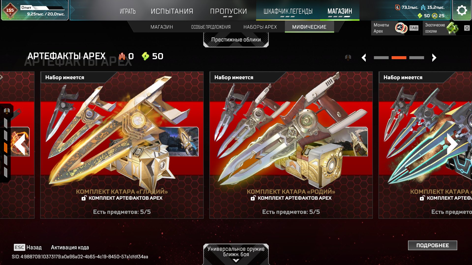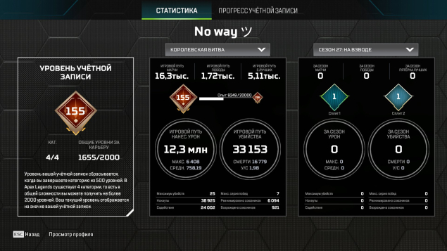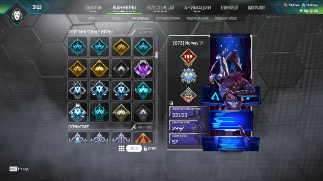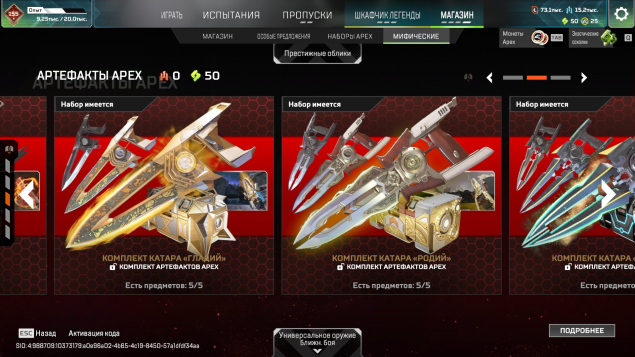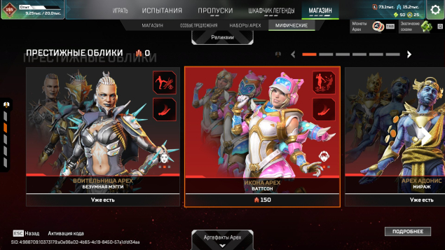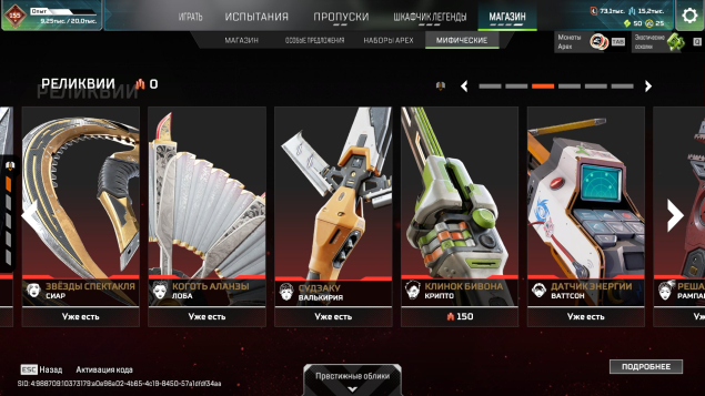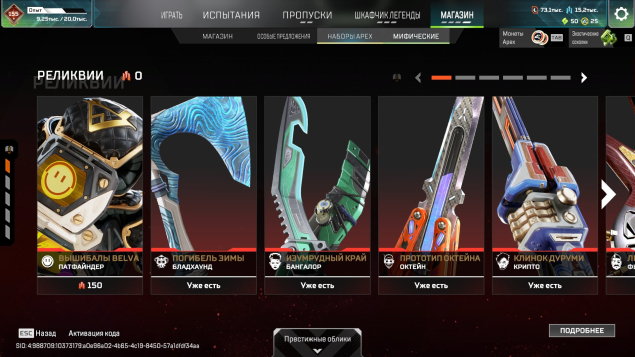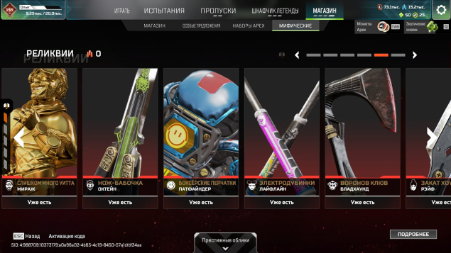 Подробное описание: Аккаунт личный. Есть одна двух недельная блокировка (за общение в чате). В остальном все чисто. Не хватает двух реликов для легенд (Оригинального ножа Бангалор, и Реколора меча Крипто). Катар все вариации, Керамбит все вариации, Мечь Бастер, и еще много чего (смотерть скриншоты). Молоточки на всех персонажах, черепки на 6 помоему(точно не помню). Бп с 11 сезона по 25 полностью заккрыты. Нет двух реликвий на персонажей (Ватсон, Лоба), остальные все есть. 1600+ легендарынх предметов. Все pay to win скины в наличии (с удобынми мушками). В рейт играл крайне мало так что нечем тут хвастаться.