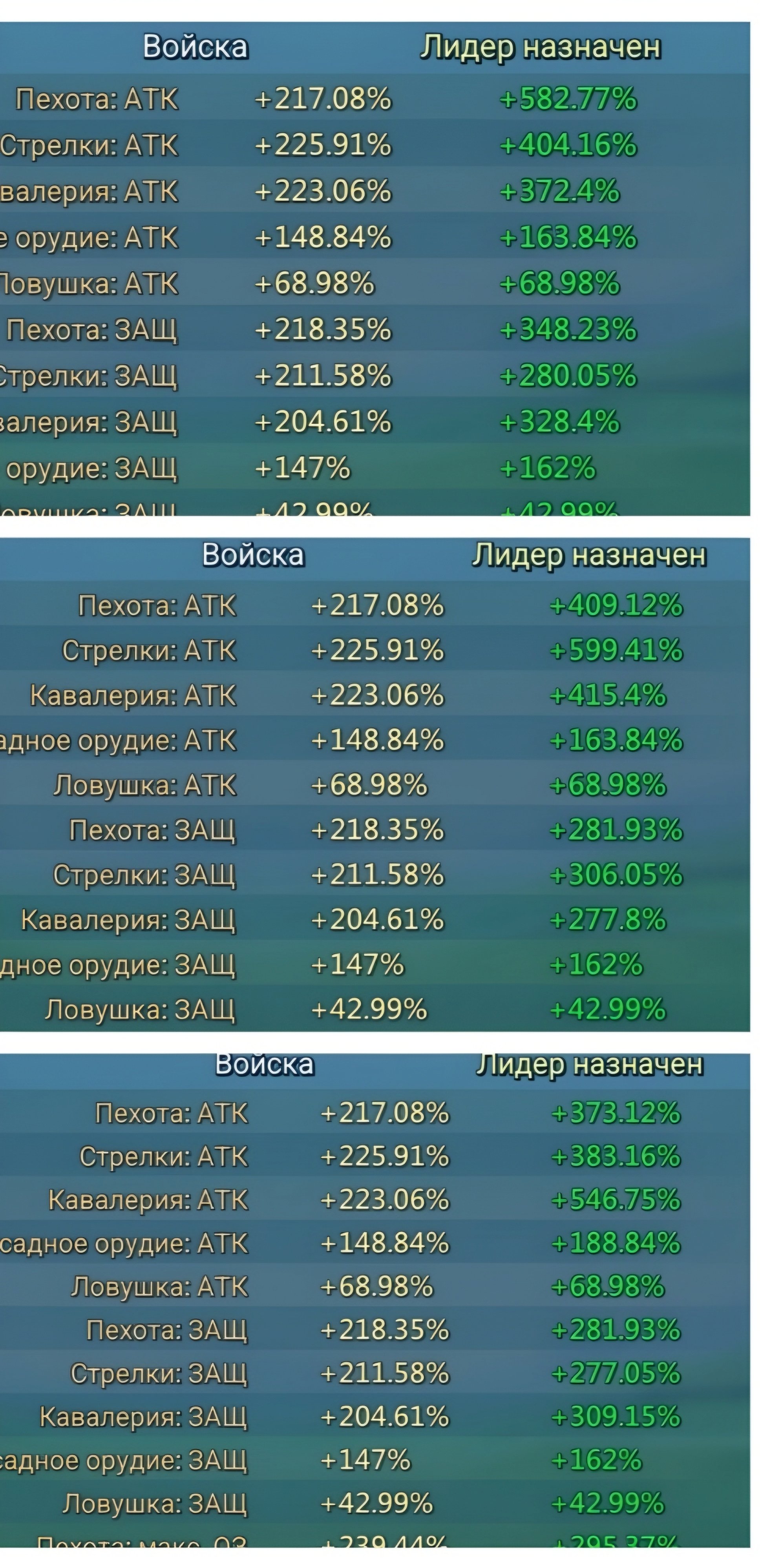 Статы пехи — 582%, луки — 599%, кони — 560%.