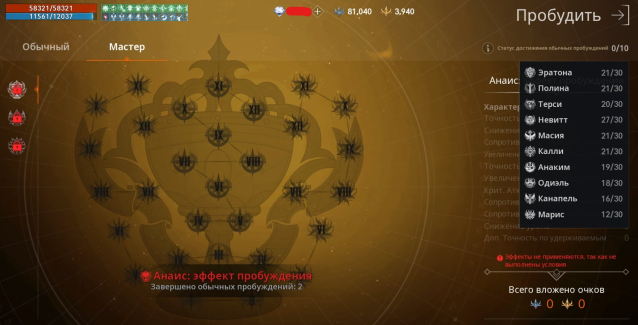 Эратона 9-9-9 +2 скилл; Полина 9-9-9 +2 скилла; Терси 9-9-8 +2 скилла; Невитт 10-12-11 +2 скилла; Масия 9-9-9 +2 скилл; Калли 9-9-9 +2 скилл; Анаким 9-8-8 +1 скилл; Одиэль 8-8-8 +1 скилла; Канапель 8-7-7 +1 скилл, Марис 6-6-6 +0 скилл.