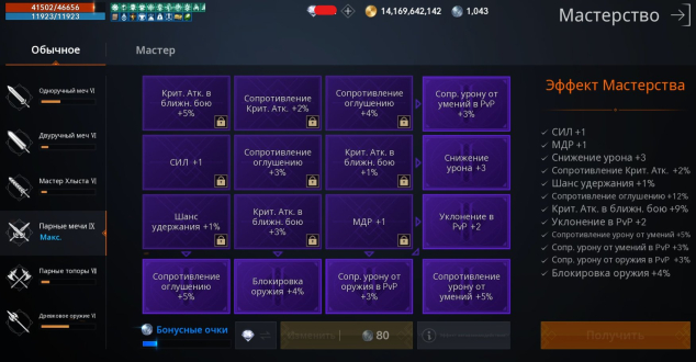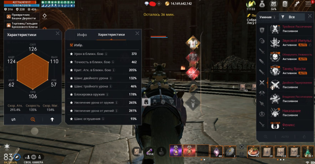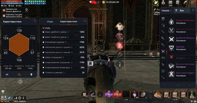 ℹ️ Другие Характеристики: Крит Атака 205%, Шанс Двойного Урона 132%, Шанс Тройного Урона 46%, Блокировка Оружия 178%, Увеличение Урона от Оружия 265%, Увеличение Урона от Умений 261%, Сопротивление Оглушению 119%, Шанс Оглушения 93%.