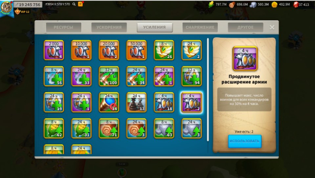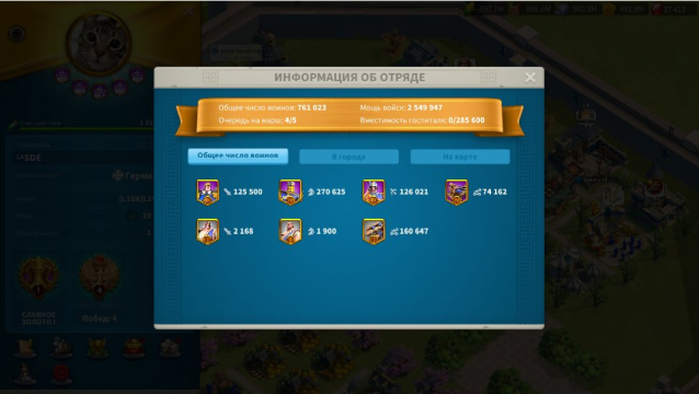 • Армия: (Скрин) Кавалерия т4 270к+ пехота т4 125к+, Лучники т4 126к+