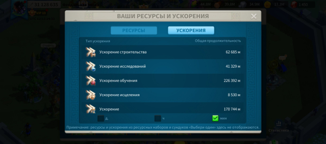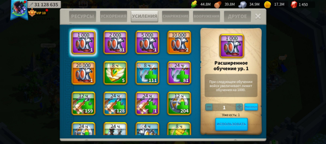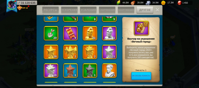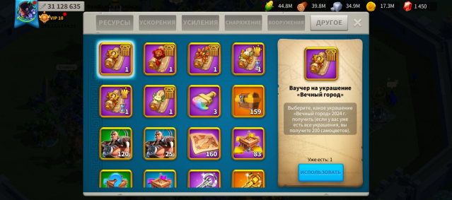 🔥 В сумке персонажа лежит много ресурсов и ускорений, которые в случае чего помогут Вам при возобновлении игры (видно на скриншотах). Также на аккаунте много всяких прочих усилений войск / ресурсов. В разделе «Другое э» хранится много золотых / серебряных ключей, книжек опыта для командиров, ваучеров на украшения города, золотые головы командиров, очки действий.
